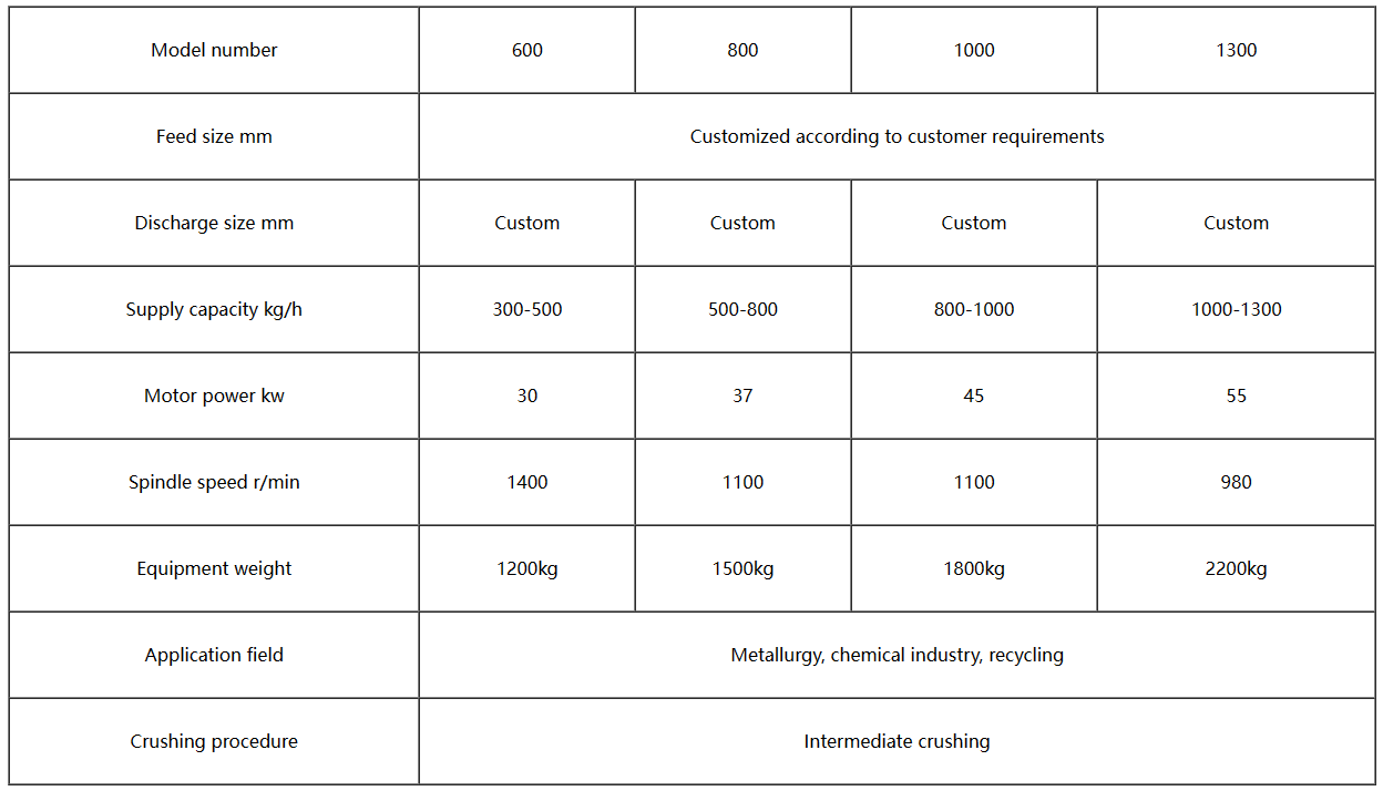 Hammer crusher is also called hammer crusher, referred to as hammer breaking machine, is a kind of equipment that breaks materials in the form of impact. Hammer crusher is composed of box, rotor, hammer head, counter lining plate, screen plate, etc., can adjust the grate gap according to user needs, change the discharge particle size, to meet the different needs of different users, mainly suitable for lithium battery, circuit board and other metal crushing medium and brittle materials, such as circuit board, lithium battery, cans, aluminum slag and other metal materials in the crushing and fine crushing operation.